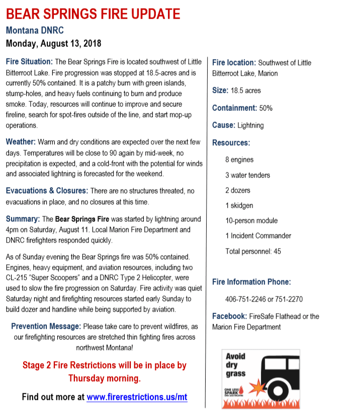 Bear Springs Fire Update—08/13/2018 Published on August 13, 2018 · By MFD Staff Share this post: Email (opens in a new window) Facebook (opens in a new tab) X (opens in a new tab) ← Back to News