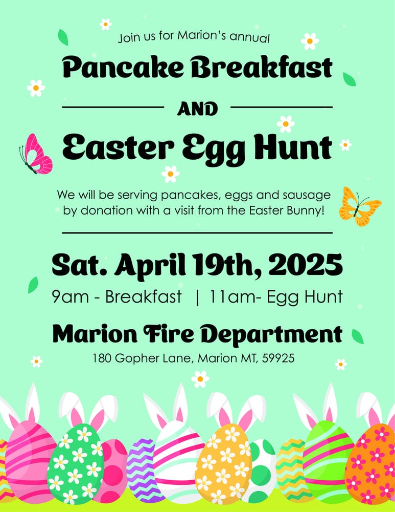 Come Join us for our annual Pancake breakfast and Easter Egg Hunt. Free breakfast served from 9am to 11 am. Egg Hunt for the kids will start at 11am. A special guest may make an appearance.