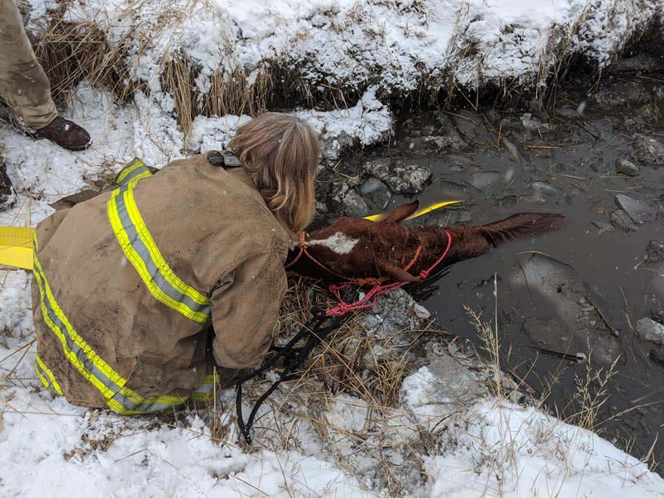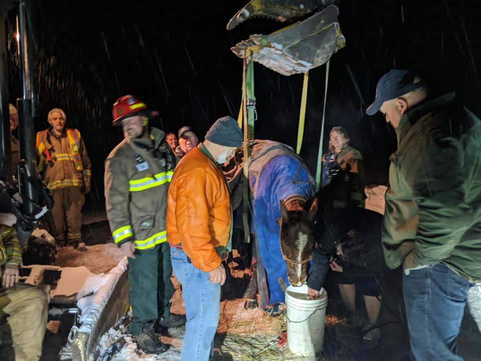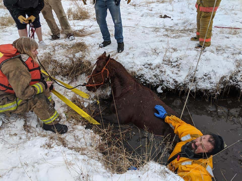 Here's a feel good story for a rainy Tuesday. Yesterday the Marion fire crews, along with officers from Flathead county animal control were dispatched for a horse that had broken through ice and was stranded in a swampy canal. Crews worked to free the cold, exhausted horse, eventually lifting him from the water. He was too energy spent to stand on his feet, with the help of equipment we assisted him to his feet and eventually to the back of a horse trailer. As of today, Henry is doing well and we hope he continues to improve! A huge thank you to Flathead county animal control officers, Laselle Equine Clinic, Montana Rockworks, Murphy's Excavating, the Hilltop Hitching Post and others who assisted in the recovery! As usual, our community came together and made it happen! 💪💪 Henry and his owner appreciate the efforts!