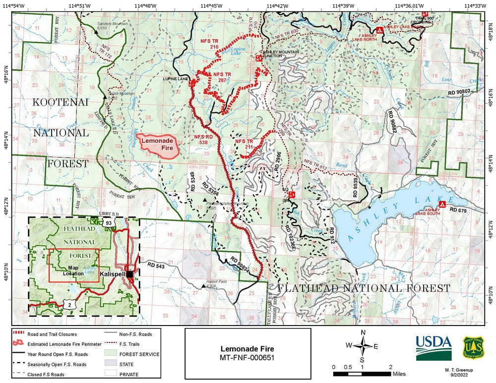 The Lemonade Fire is managed by US National Forest Service—not us. We will assist their operations as needed. For most up to date information on the Lemonade Fire, please refer to InciWeb or the Flathead National Forest alerts and notices webpage.