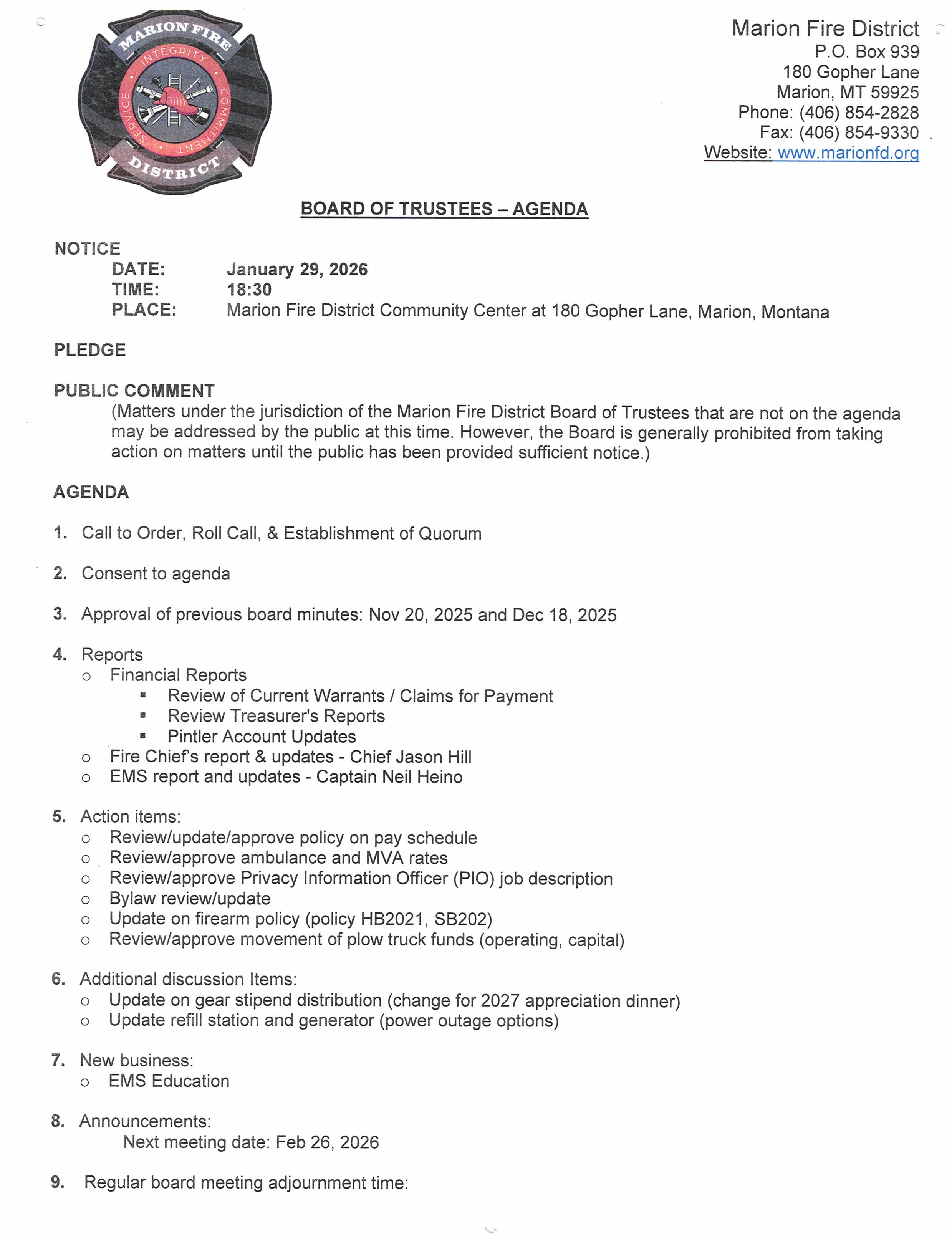 Meeting Agenda for January 29, 2026